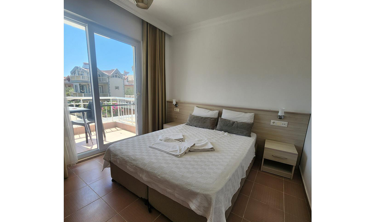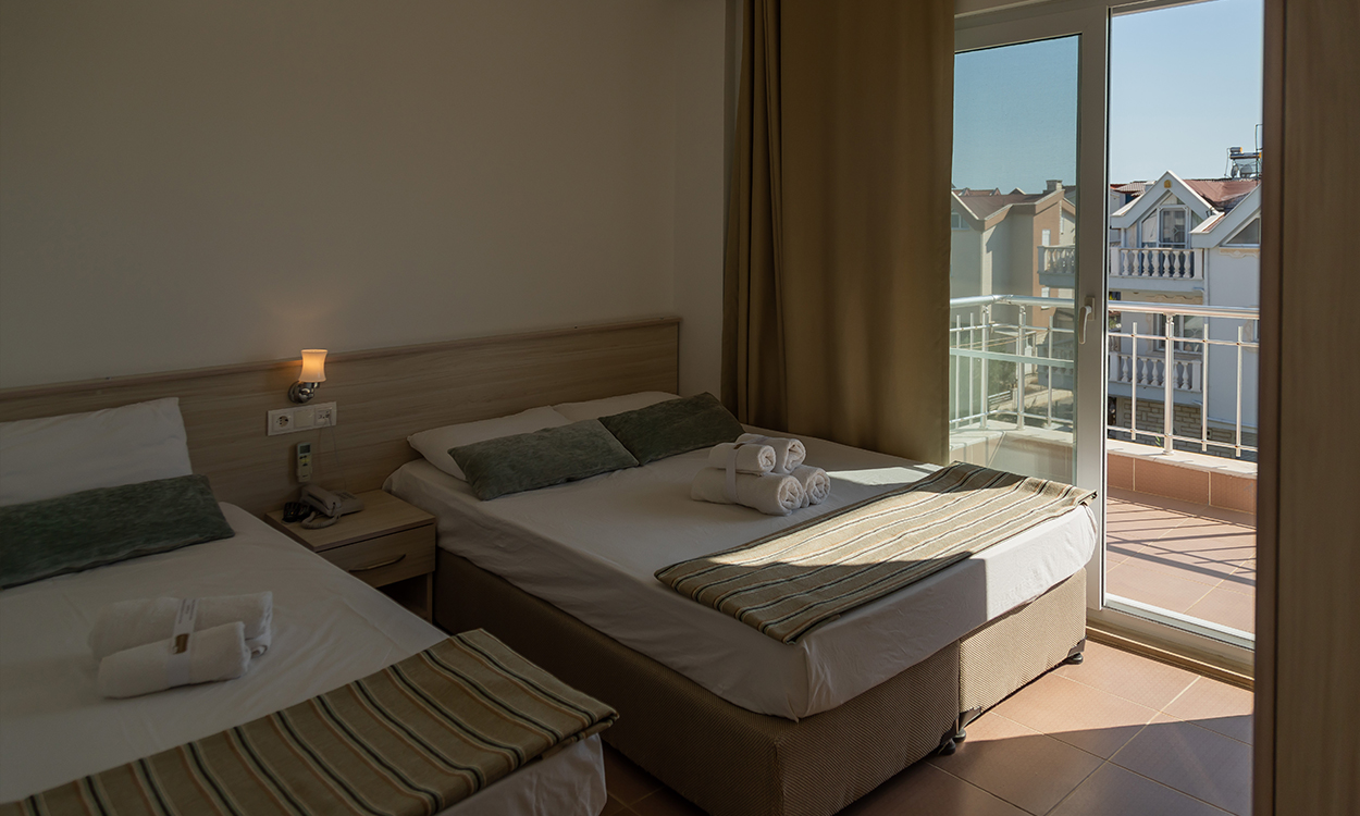 Our hotel has a total of 14 rooms, including 4 double rooms, 9 triple rooms, and 1 family room for four people. Each of our rooms has a spacious balcony, fire alarm system, air conditioning, television, mini fridge, hairdryer, and Wi-Fi internet service. Our hotel has a parking lot monitored by 24/7 security cameras.